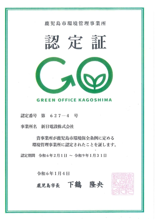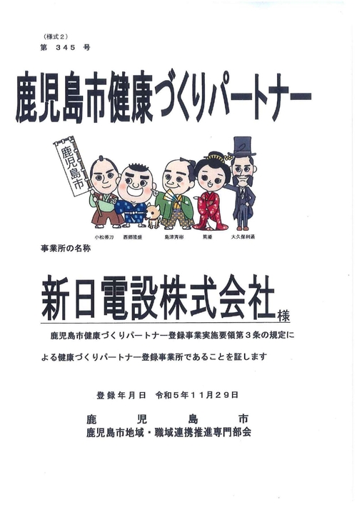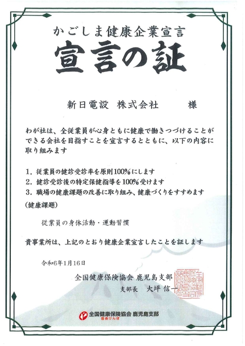 新日電設は、地域社会への貢献と職場環境の向上を目指し、健康づくりや環境への取り組みなど、さまざまな分野での活動を推進しています。その取り組みが評価され、行政機関や関係団体より認定・登録を受けています。